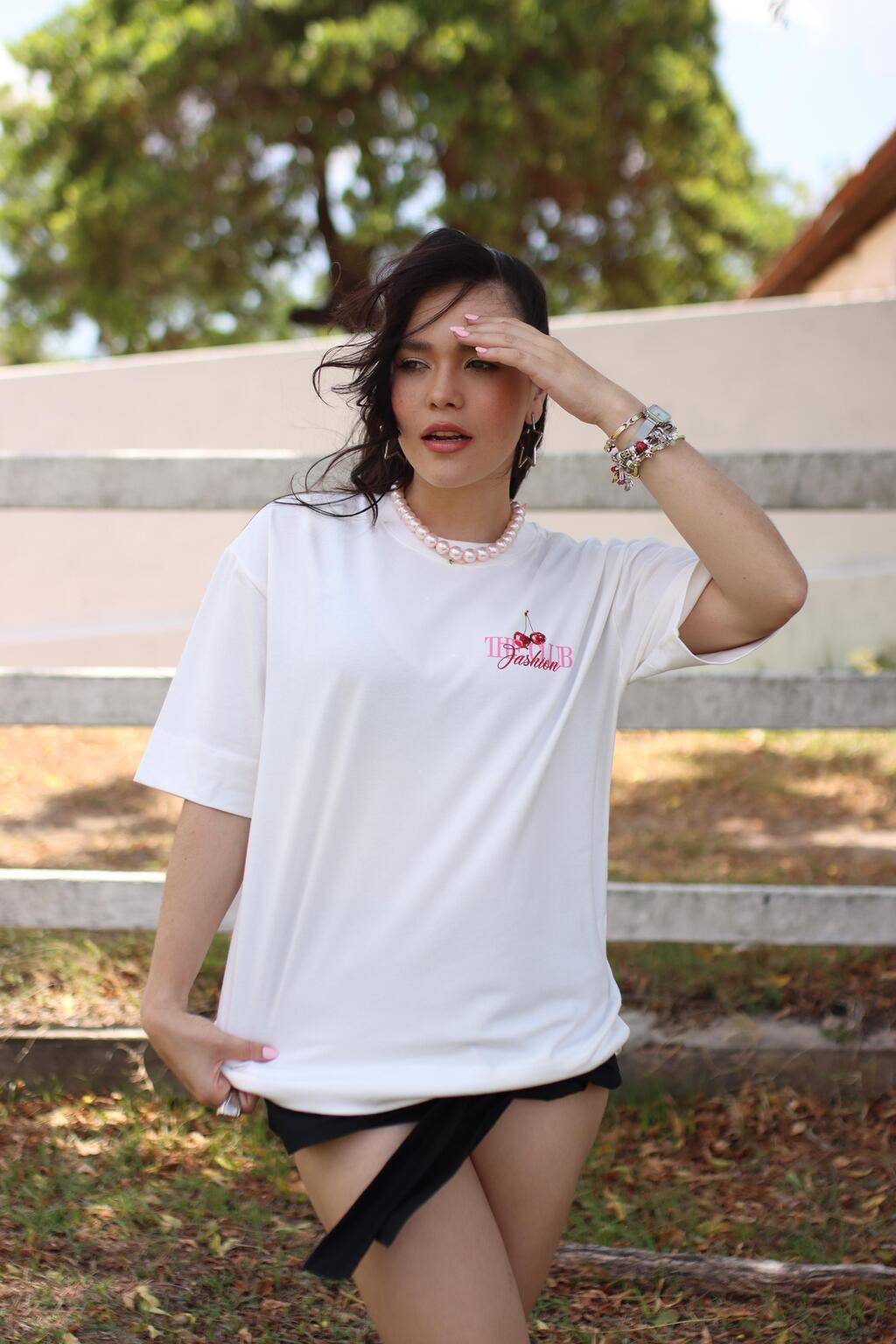 T-shirt em malha de algodão com elastano, modelagem oversized, gola arredondada em tecido canelado, com aplicação frente (no peito) e costas.