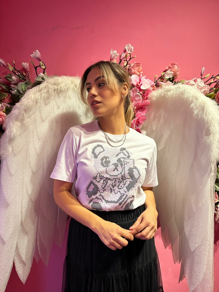 T-shirt 100% algodão, modelagem básica, gola arredondada em tecido canelado. Aplicação de urso em pedrarias.