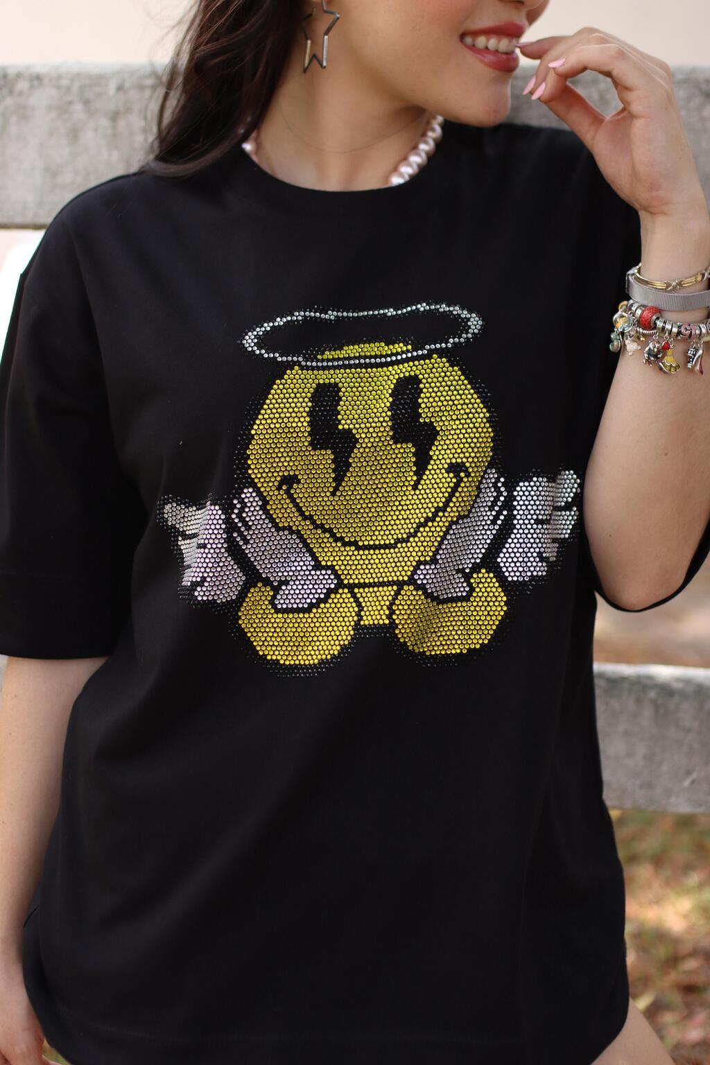 T-shirt em malha de algodão com elastano, modelagem oversized, gola arredondada em tecido canelado. Aplicação de anjinho em pedrarias.